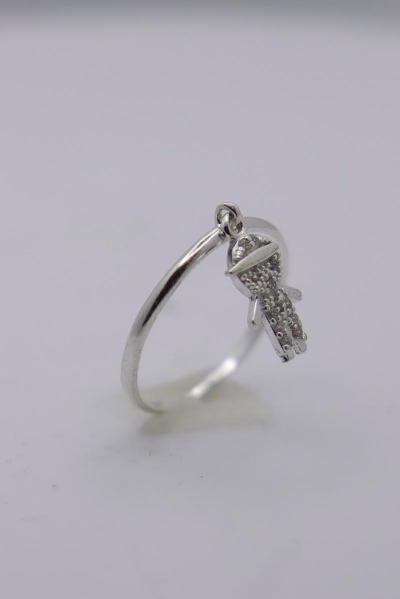 Lindo anel em prata com pingente em formato de menino, com detalhe em pedraria. Sugere delicadeza e representa amor por um menino importante. Ideal para presentes.