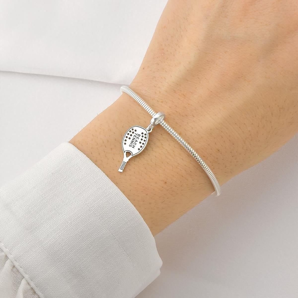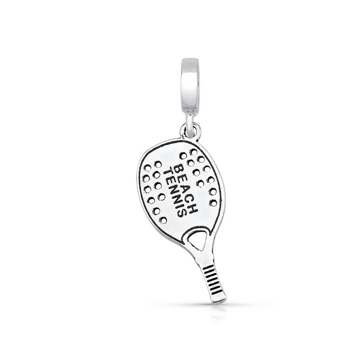 Berloque Raquete Beach Tennis de Prata 925, este berloque é composto por prata liso em forma de um raquete com "Beach Tennis" escrito nos dois lados, com uma argola;