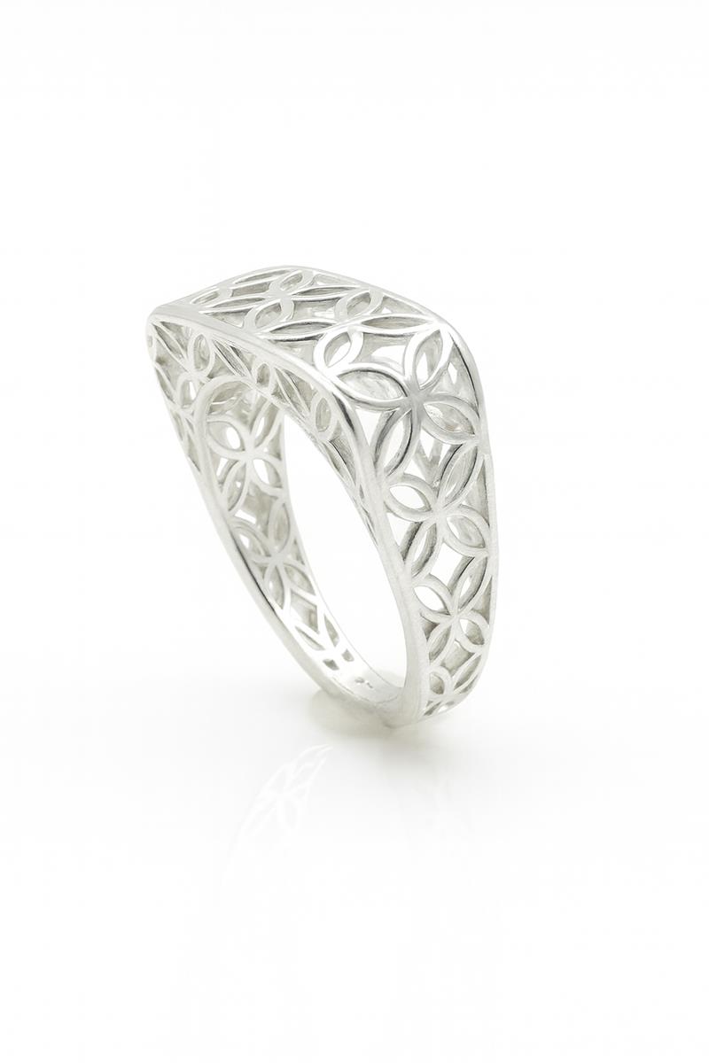 Um design moderno e sofisticado, este anel em Prata 925 possui acabamento vazado com delicados padrões geométricos que remetem à elegância e leveza. Seu formato diferenciado, com linhas retas e detalhes rendados, traz personalidade única à peça, tornando-a ideal para quem busca estilo e exclusividade.