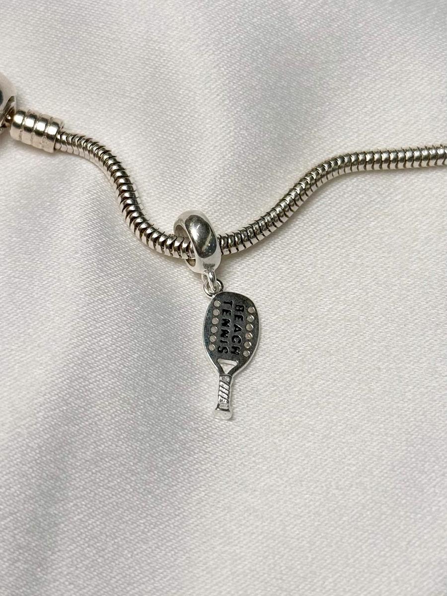 Berloque Raquete Beach Tennis de Prata 925, este berloque é composto por prata liso em forma de um raquete com "Beach Tennis" escrito nos dois lados, com uma argola;