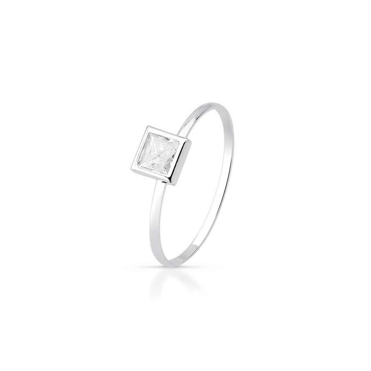 Anel Solitário Cravação Inglesa Quadrado Cristal de Prata 925, composto de prata liso e uma pedra em forma de quadrado preso por um borda de prata;